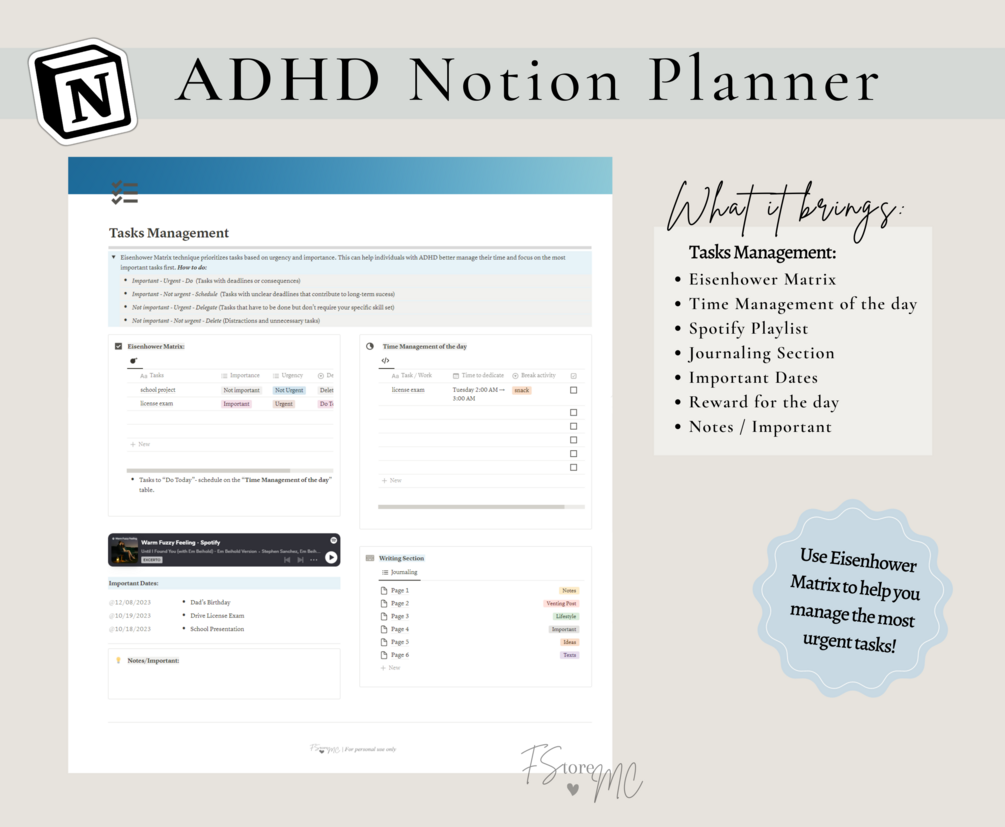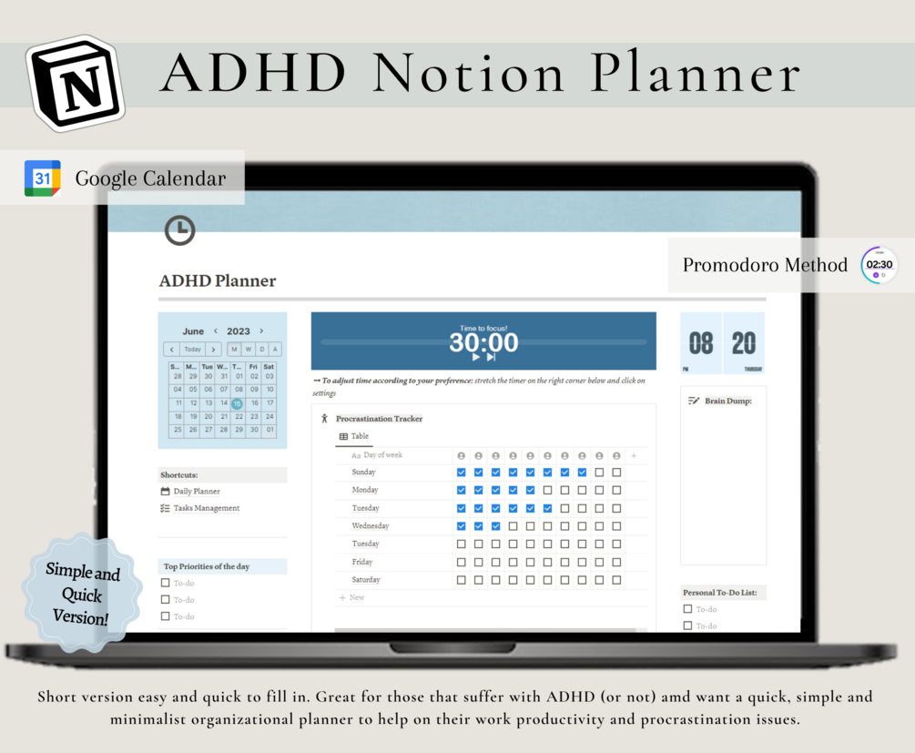 ADHD Notion Planner: Notion template, Easy and simple to fill in, Organization, daily planner, promodoro, Eisenhower Matrix, Personal Notion