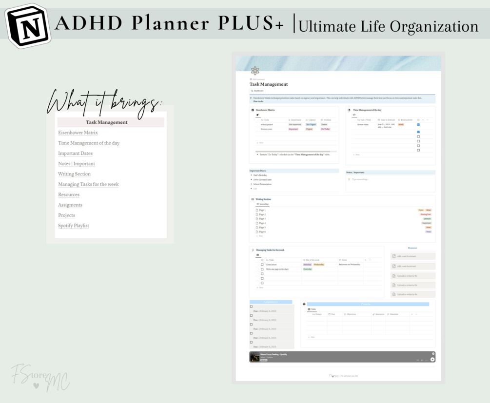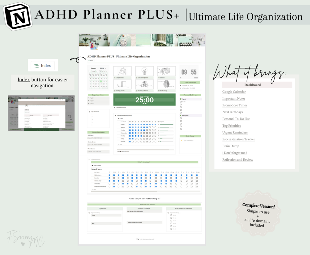 ADHD+ Notion Planner: is a complete version with all domains for life organization. It is a minimalist, versatile and customizable digital planning tool designed specifically for individuals with attention deficit hyperactivity disorder (ADHD), although its also adaptable to regular individals who want to invest on a better organization and work productivity.