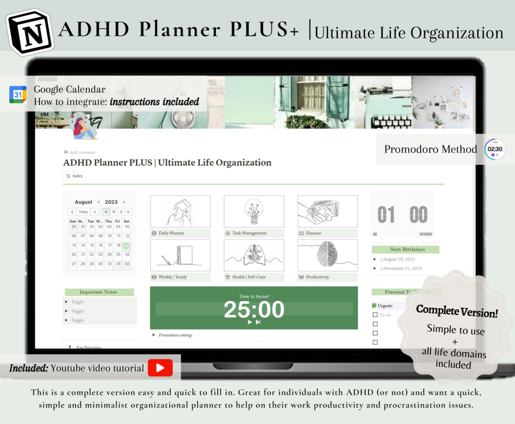 ADHD+ Notion Planner: is a complete version with all domains for life organization. It is a minimalist, versatile and customizable digital planning tool designed specifically for individuals with attention deficit hyperactivity disorder (ADHD), although its also adaptable to regular individals who want to invest on a better organization and work productivity.