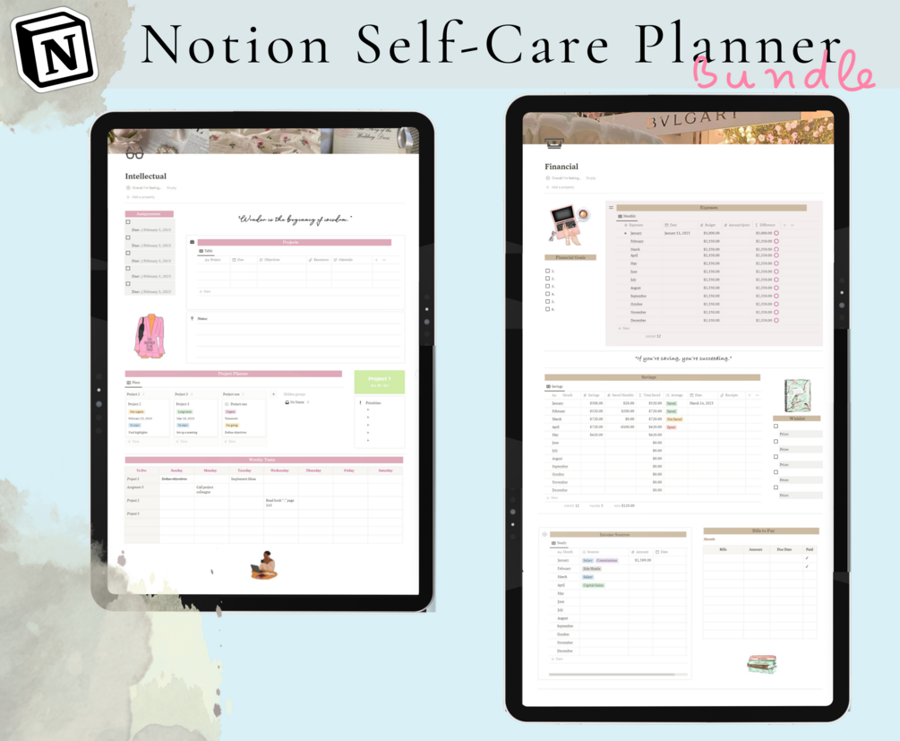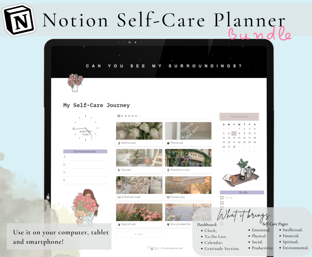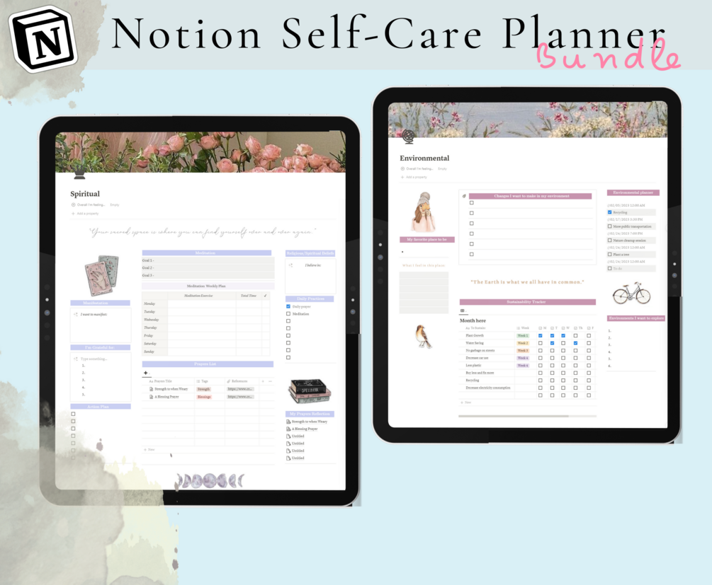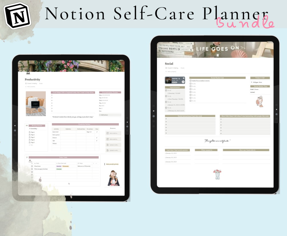 Notion, Notion Template, Notion Self Care, Planner Bundle calendar, emotional, spiritual, physical, social, productivity, intellectual, etc