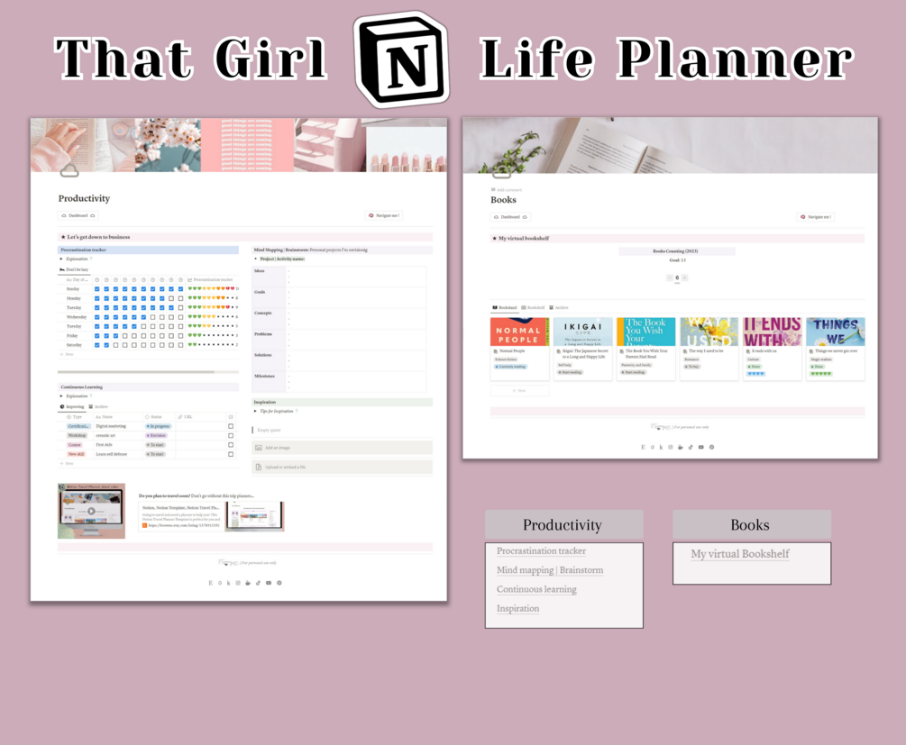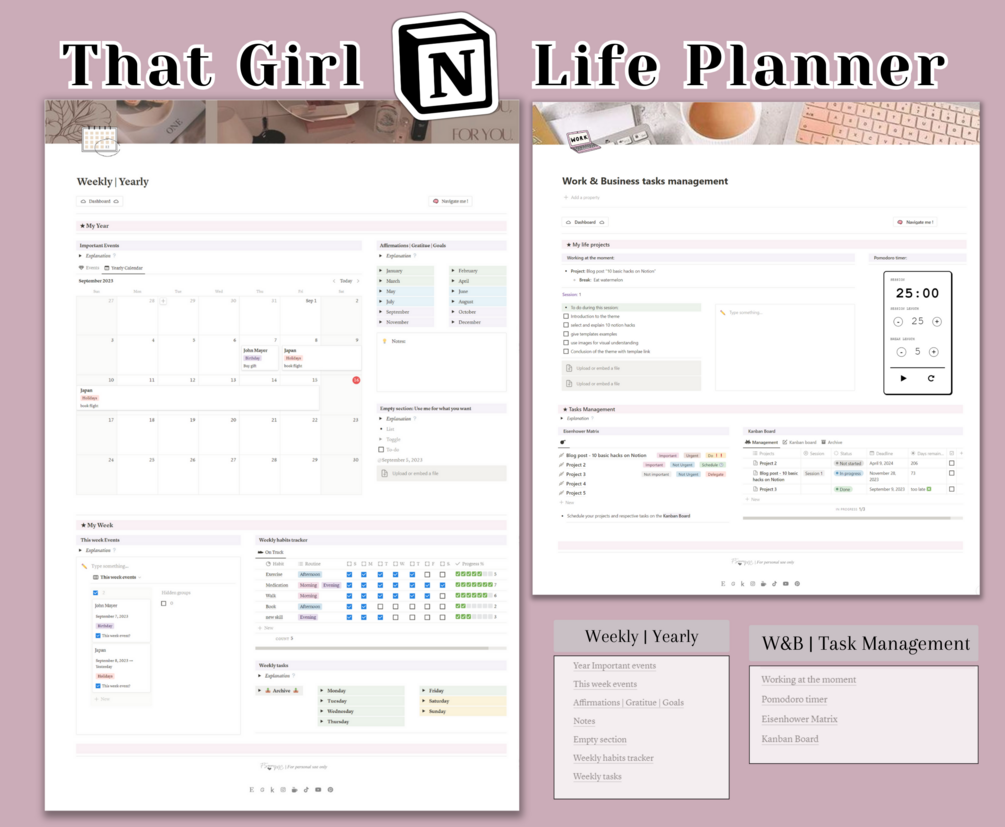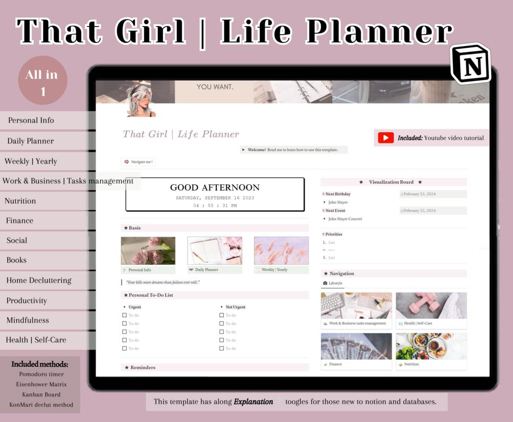 That girl Notion Life Planner | Ultimate productivity & organization, all-in-one, eisenhower matrix, kanban board, konmari method, pomodoro